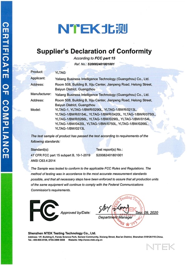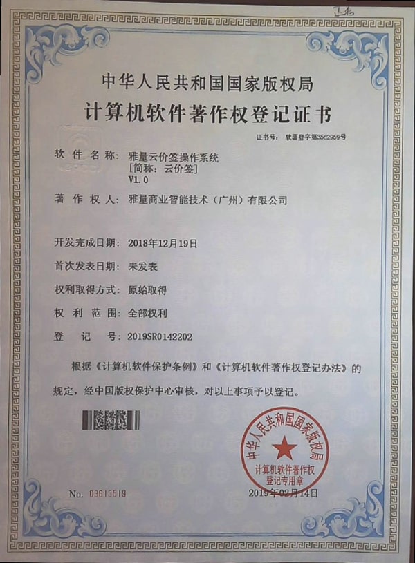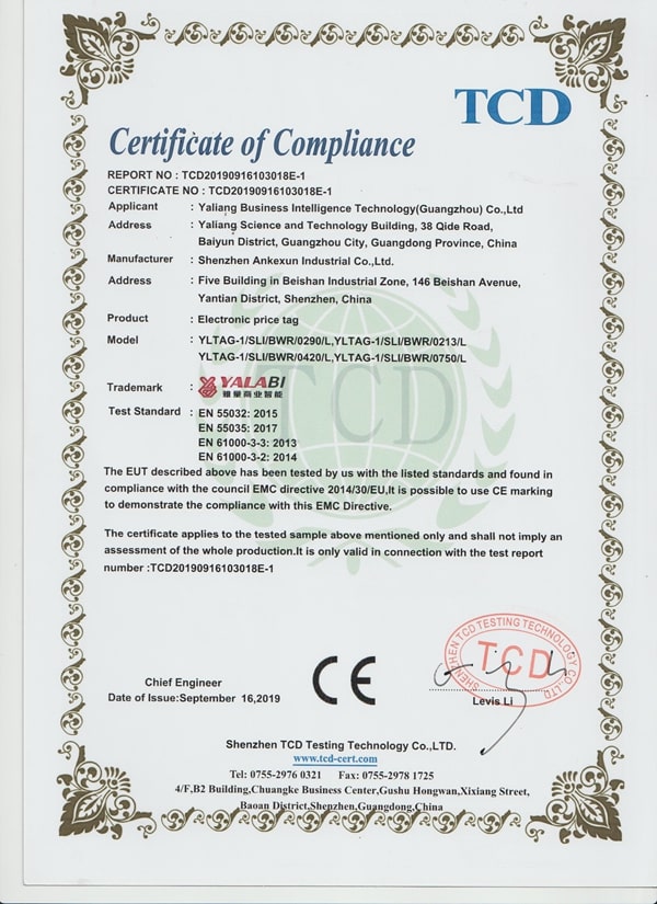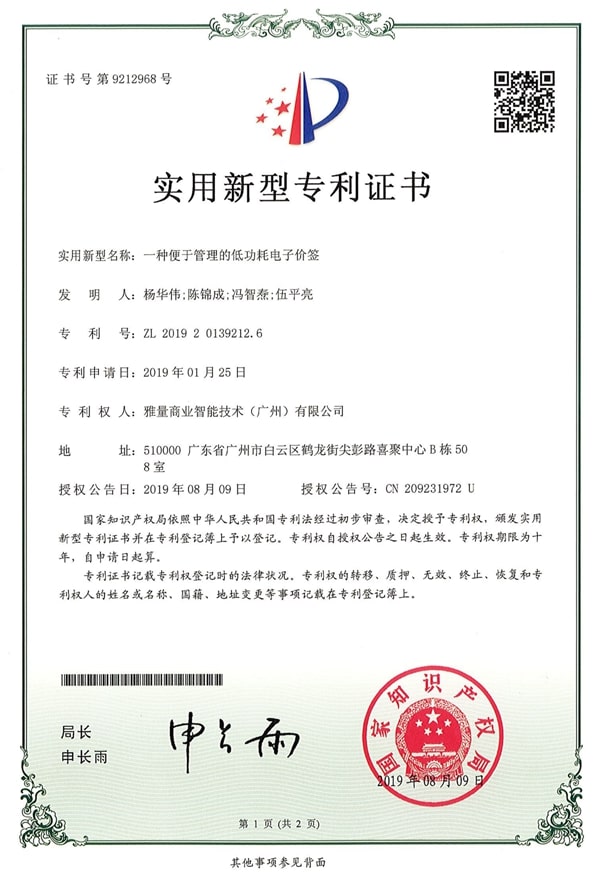 Certificat de brevet de Étiquettes de vente au détail numériques YalaTech