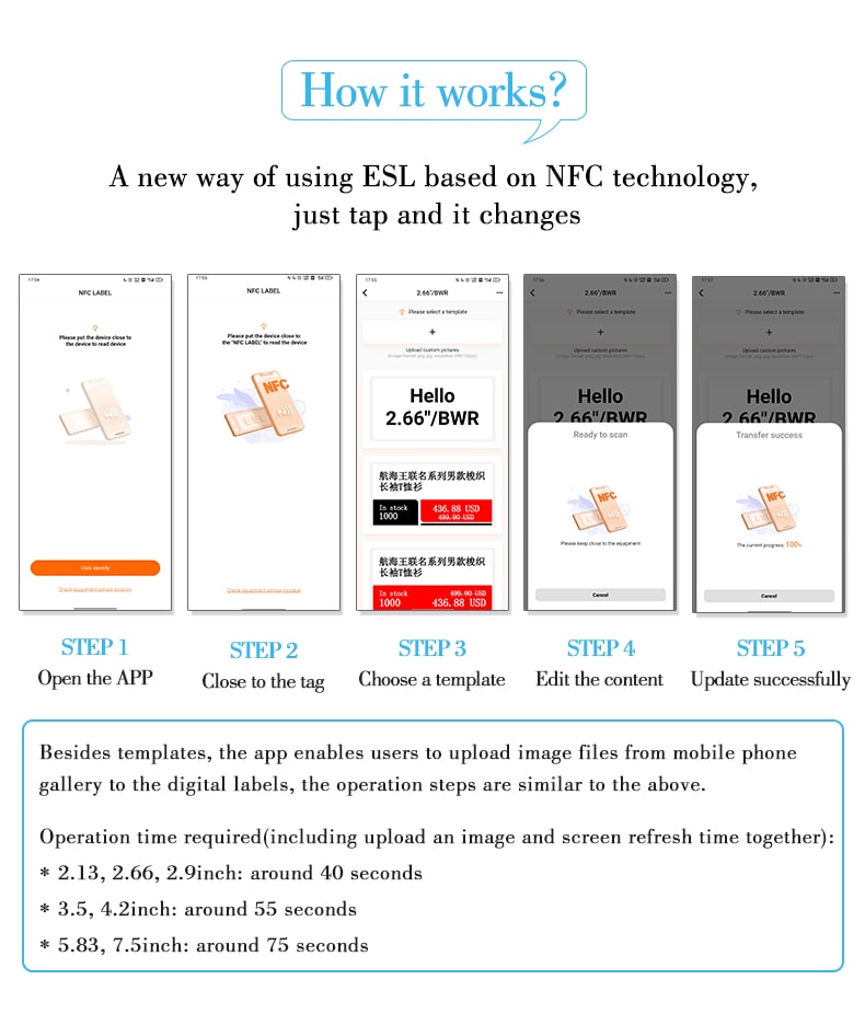 Il s'agit d'une étiquette numérique qui peut être rafraîchie par le téléphone mobile NFC. Il accélère l'entrée des écrans epaper dans davantage de scénarios d'application, notamment la vente au détail, les bureaux, les espaces publics, etc.